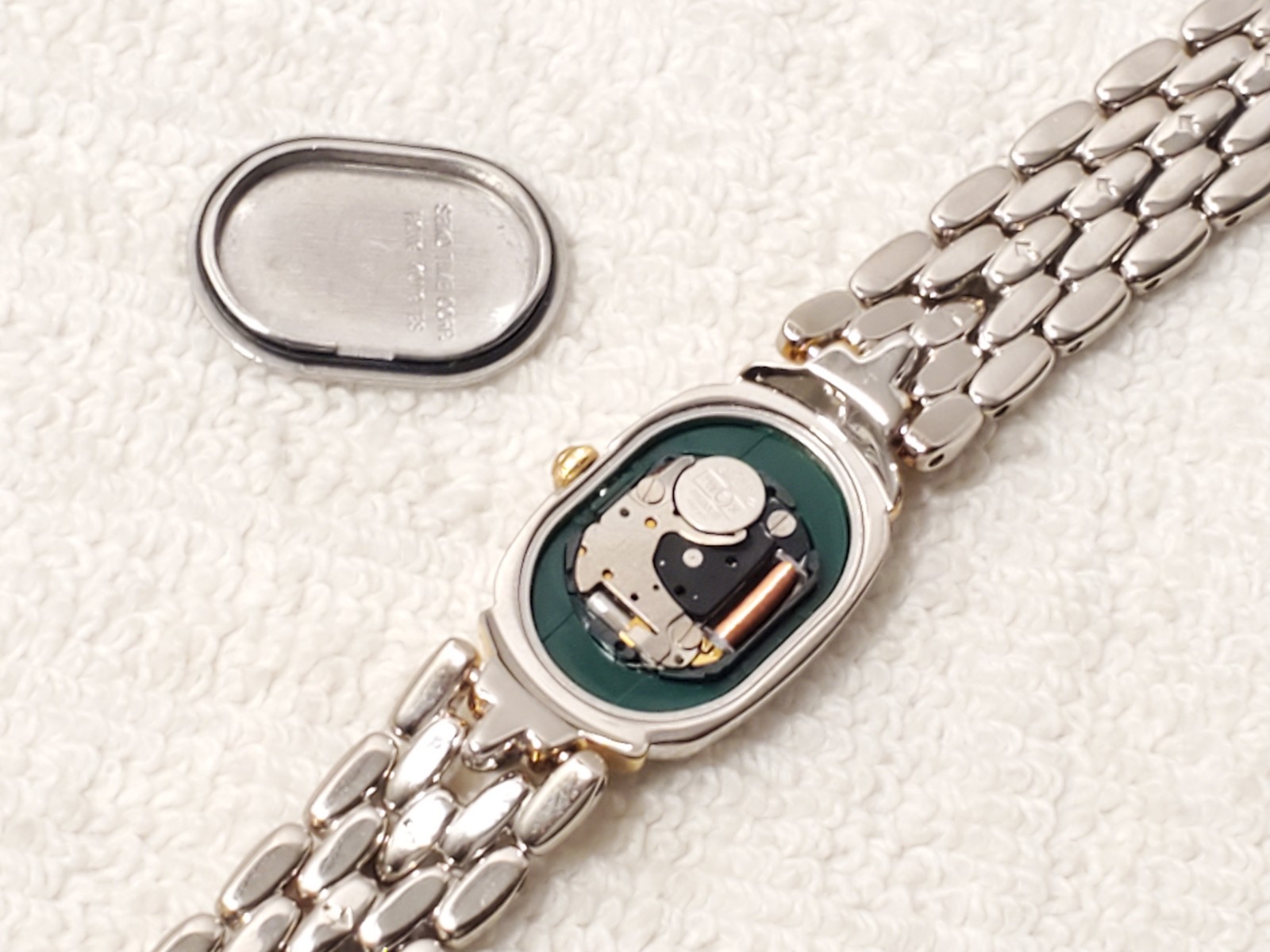 NO SCRATCHES OR SCUFFS MINERAL CRYSTAL GLASS WINDOW. NO PERSONAL OWNER. NEVER USED. LIKE NEW CONDITION WITH TAG. New MAXELL battery installed NOVEMBER 2025, tested, inspected, and witnessed, everything works, fully functional as manufactured, smoke and pet free, CLEAN, DETAILED, POLISHED, BRIGHT, SHINY, ready to wear. Wrist fit comfortable 6 3/4". Max 7" tight fit can adjust to fit a smaller size. Photos may be brighter than the original color. Case size 15m, thickness 6m, gold tone, stainless steel, base metal, vintage 1990's, removable links, jewelry clasp, roman numeral at 12 o'clock.